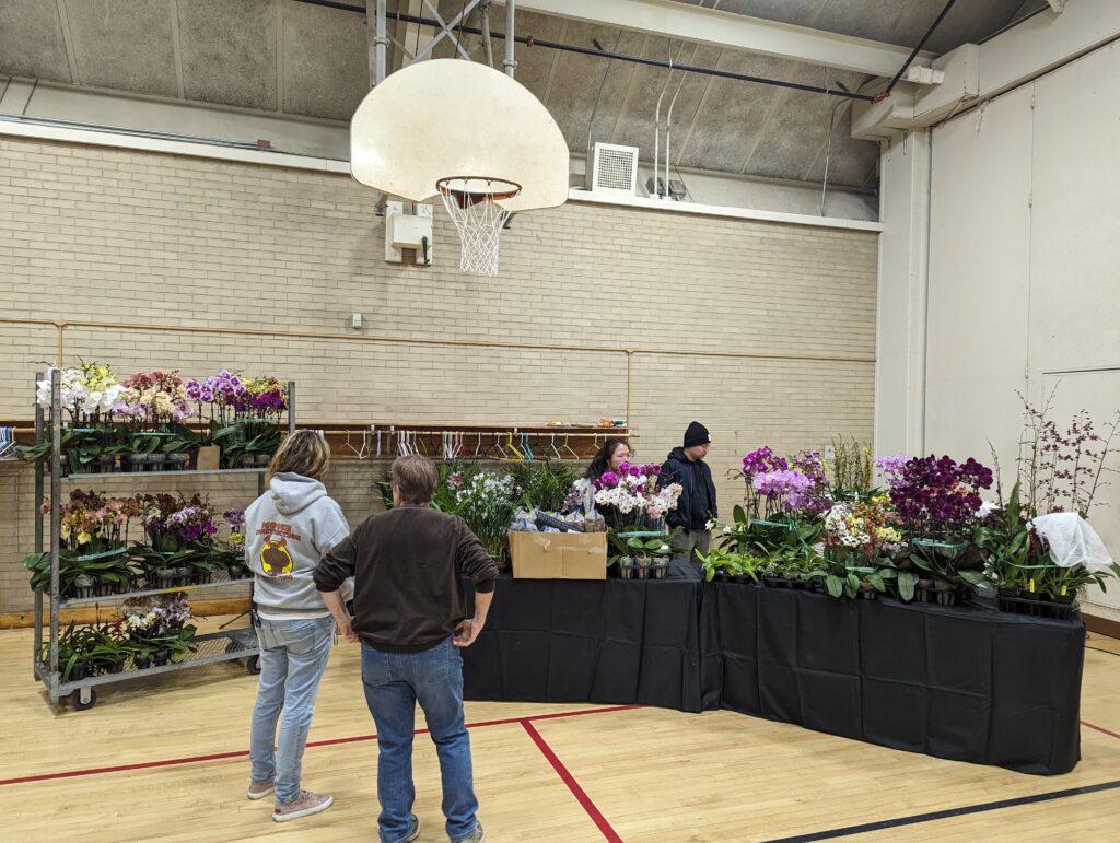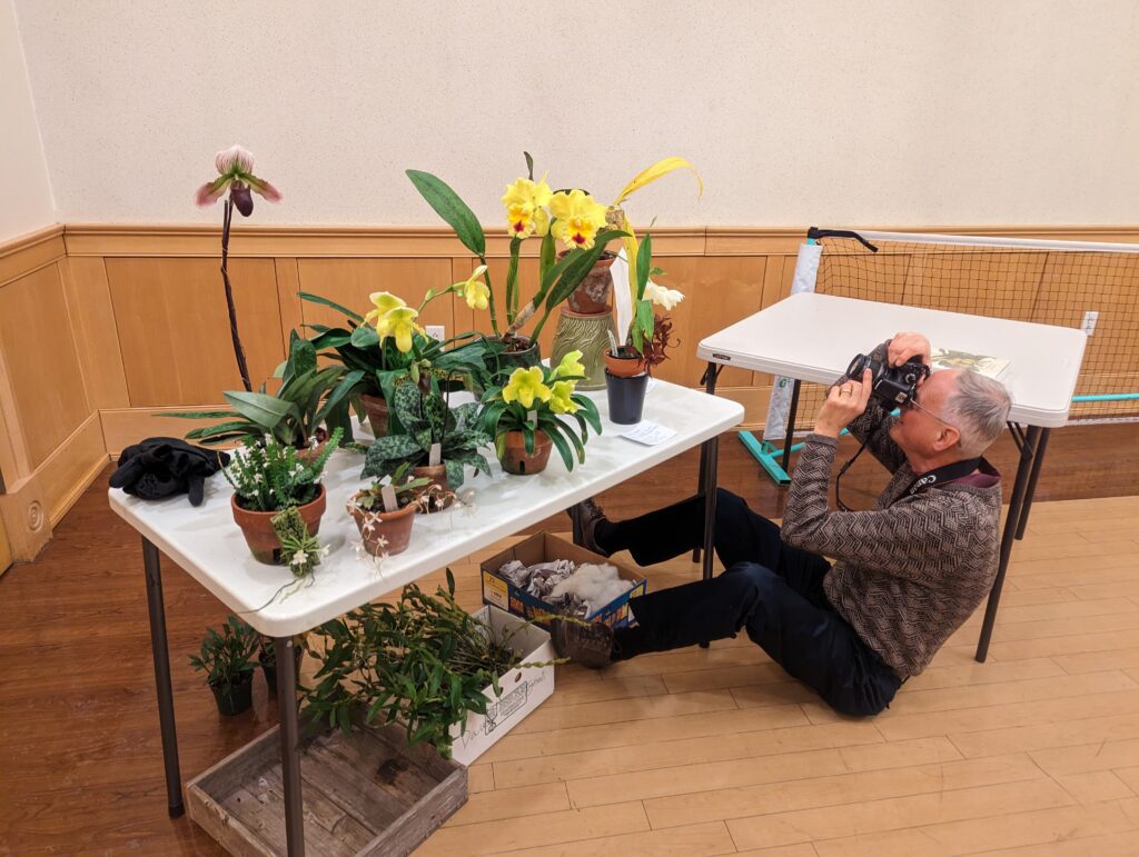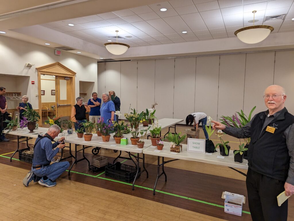A plant show table, set up by 6:30 p.m., orchids grown by our members are displayed